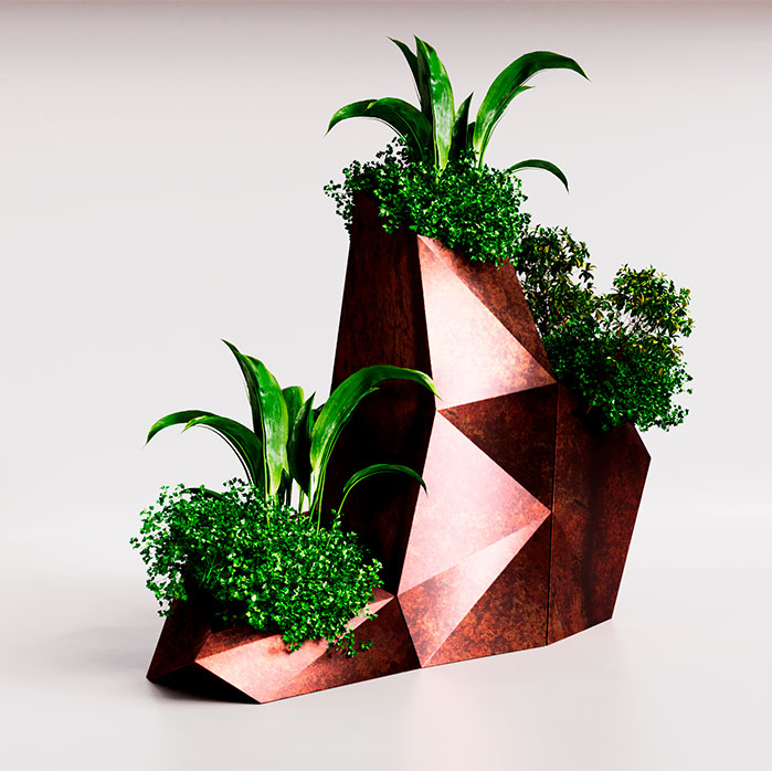 This contemporary geometric flower stand combines modern design with functionality, featuring an angular form that offers an industrial yet earthy aesthetic. The varying heights of the planter sections create a visually layered display, contrasting beautifully with the organic greenery. It’s both a functional piece and a striking work of art, perfect for enhancing indoor or outdoor spaces.